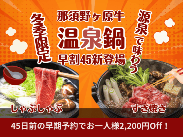 四季の森に包まれる豊かな眺望の中、湯けむりがほのかに立ち昇る大浴場・露天風呂が旅の疲れを癒してくれます。那須高原「地蔵の湯」の良質でお肌に優しい温泉に身をまかせ、心ほぐれる至福のひとときをご堪能ください。